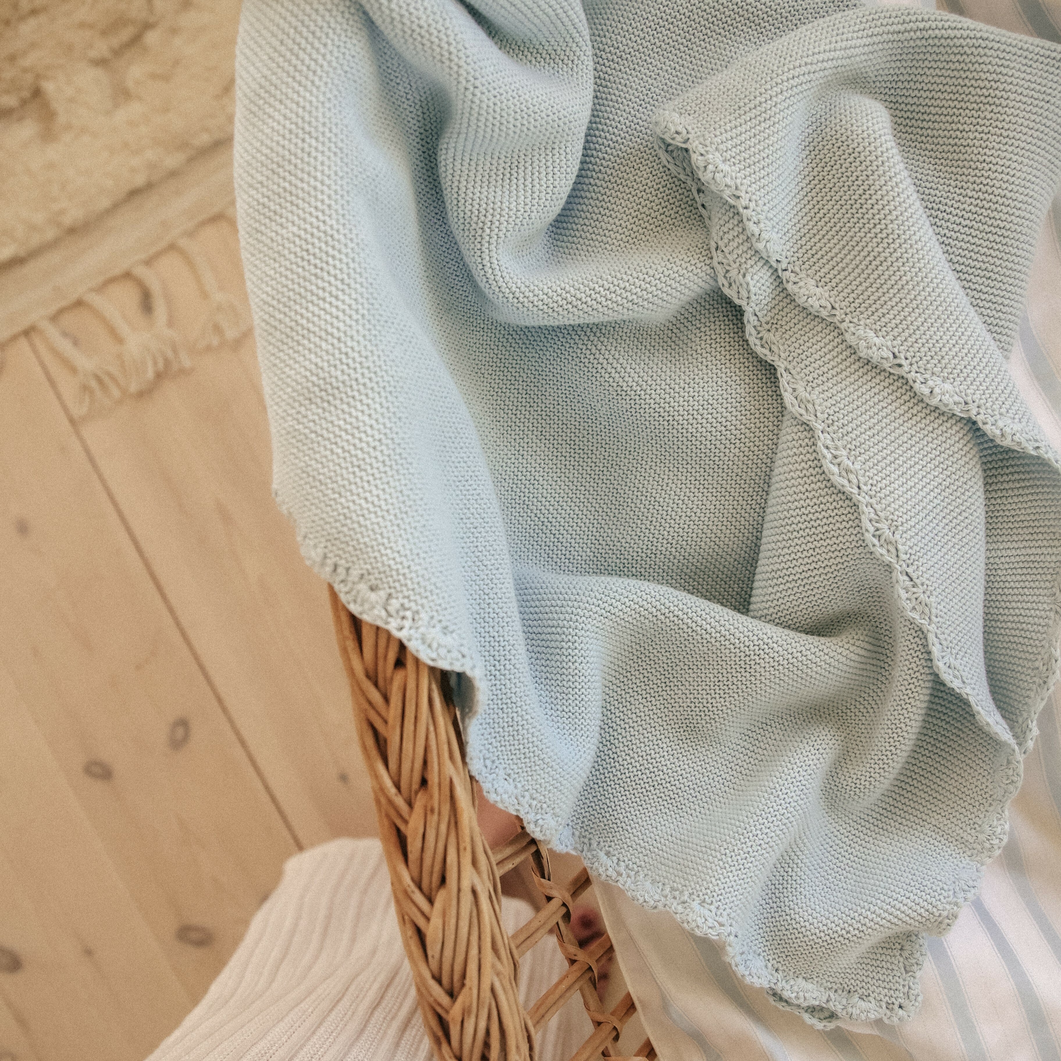 Here is the perfect gift! An everyday staple, this perfectly sized knit blanket is made for mornings in the nursery, stroller walks, and plenty of cozy moments. Knit from 100% Cotton with a cozy handstitched scalloped pattern. We love cotton because it is sustainable, kind to the skin, regulates body temperature, is highly absorbent, luxurious and durable.