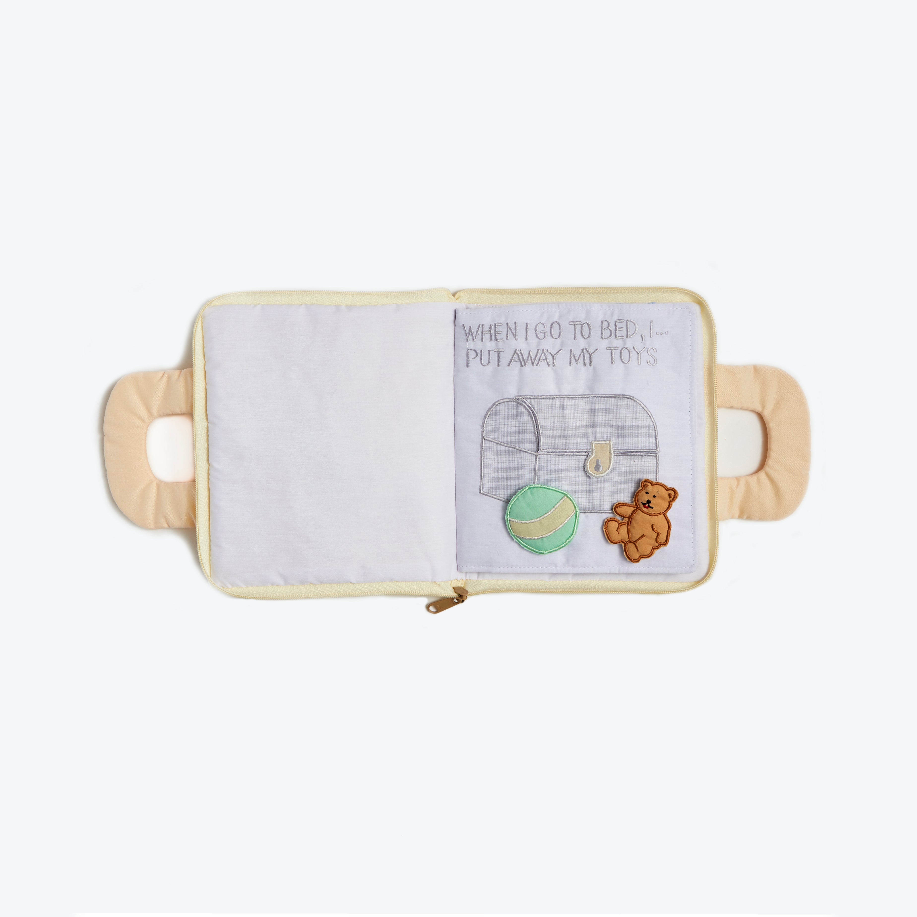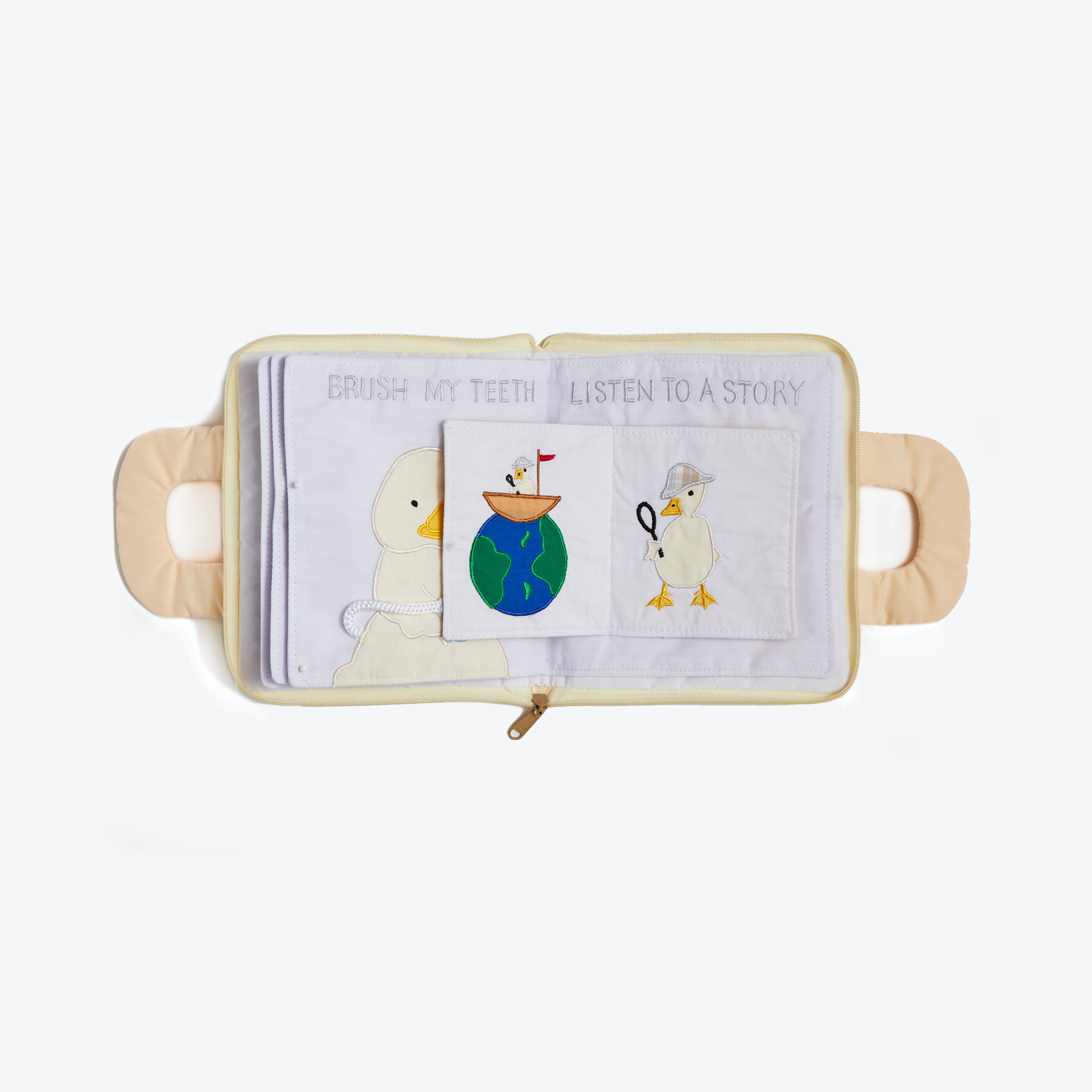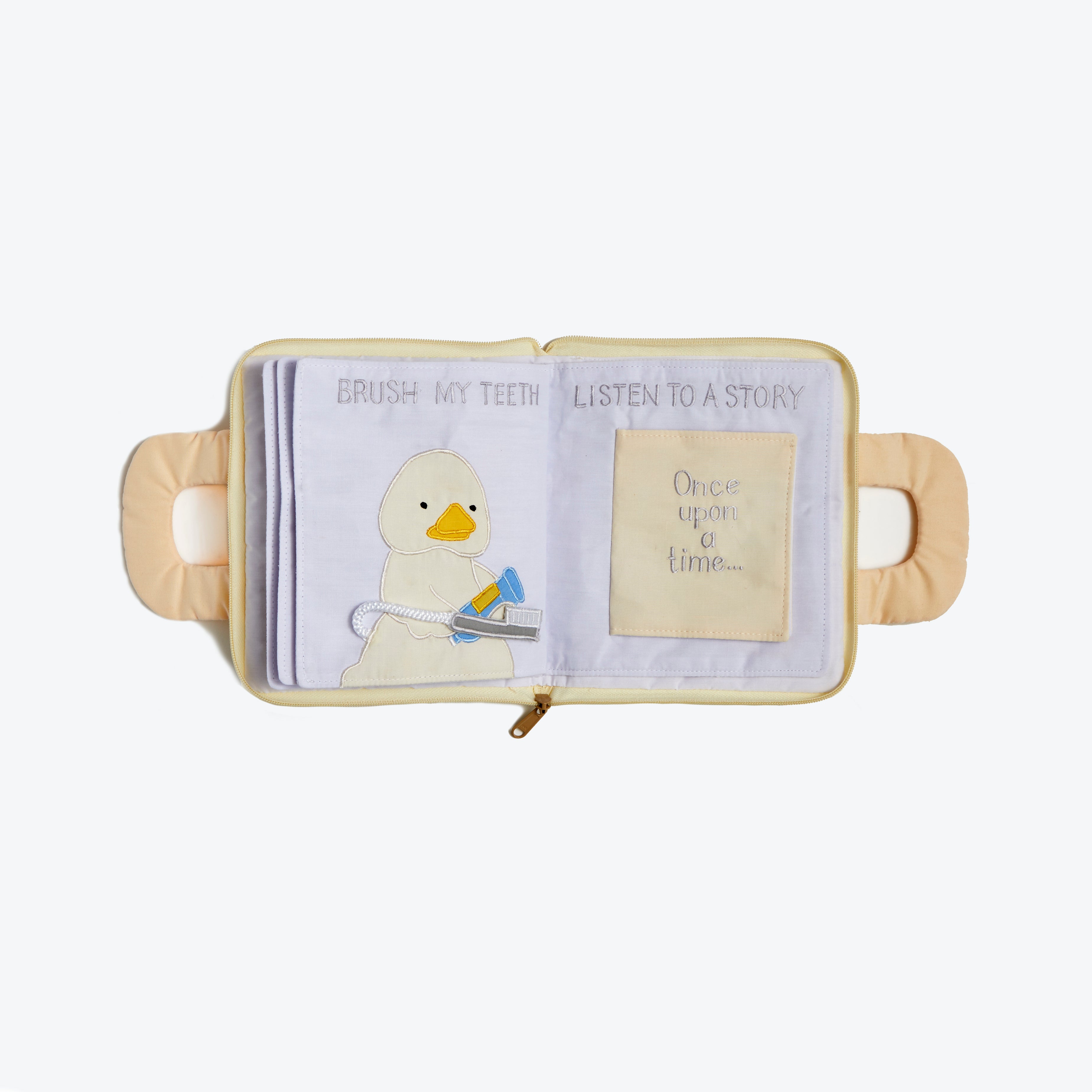 This beloved activity book is a timeless favorite, designed to enhance the joy and comfort of your little one's bedtime routine. As the adorable gooseling prepares for bed, it embarks on a series of engaging tasks: tidying up toys, shedding its feathers, enjoying a soothing bath, slipping into cozy pajamas, brushing its beak, and eagerly listening to a sleepy story. With durable handles for easy transport and a secure zipper closure, this book promises to be a trusted companion throughout all your adventures, offering gentle reminders of their essential sleep routine.