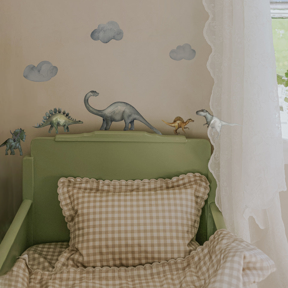 Prehistoric Wonder decals feature wandering dinosaurs and lofty clouds in muted colors. This set contains 8 individual decals.