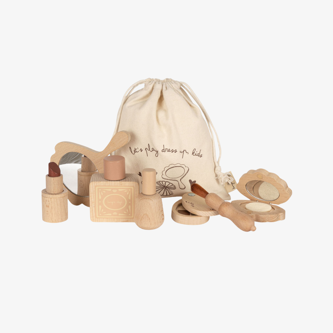 Discover the Konges Sløjd Beauty Set: This adorably cute wooden makeup set is perfect for little ones who love imaginative play and dress‑up fun. Neatly tucked inside a soft cotton bag, the set includes 7 delightful pieces—lipstick, mirror, bottle, nail polish, rouge with mirror, eye shadow and a brush—perfect for pretend‑beauty adventures.