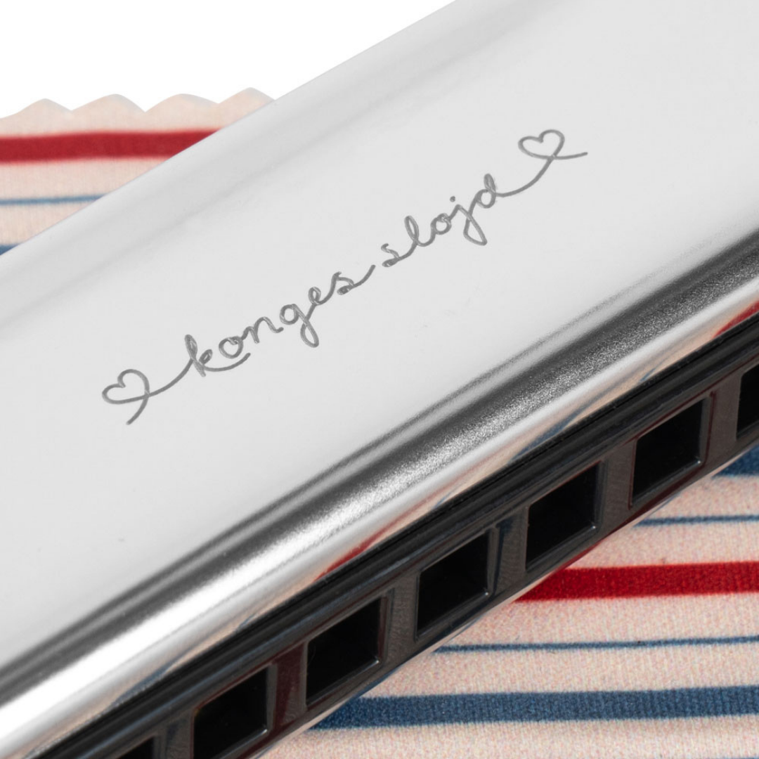 Discover the Konges Sløjd My Little Harmonica— This sweet little harmonica is made from stainless steel and is just the right size for playful moments and quiet tunes. It arrives in a charming decorative box for storage, along with a soft cotton cloth for polishing.